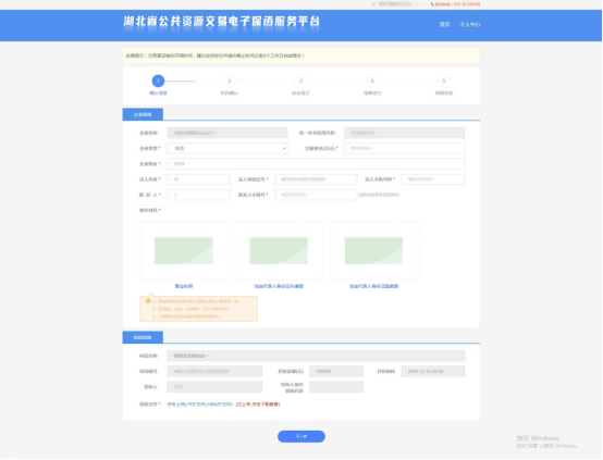 5、填写补充企业的基本信息以及招标文件的上传,点击下一步,进行保函机构选择