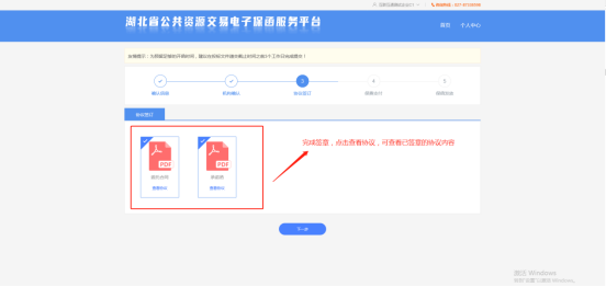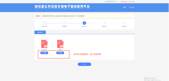 7、插入企业CA,点击电子签章,进入签章页面进行电子签章;所有协议都签章完成之后才可点击下一步